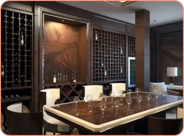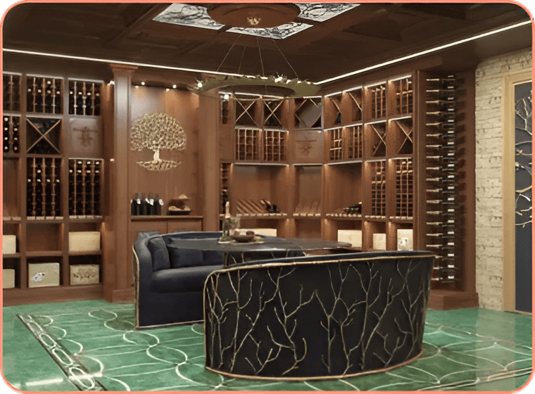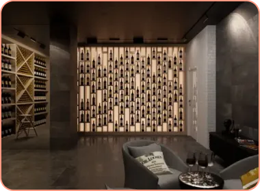 We will create a custom project tailored to your unique requirements: a modern solution with clean lines, frameless glass, chrome or stainless steel, LED lighting integrated into floating or suspended bottle displays; or a traditional version with softer edges and warmer materials such as noble wood in a classic style, brickwork, stone shelves, and soft, ambient lighting. We’ll advise you on available options — whether you want optimal storage conditions, aging, serving, or a combination of these.